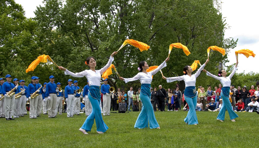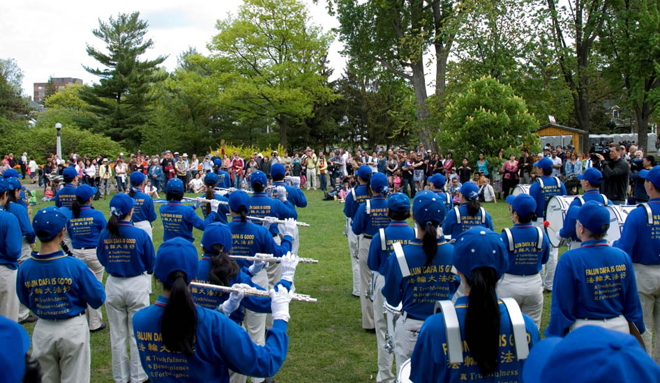 乐团成员演奏了《噢,加拿大》、《永远的枫叶》、《法轮大法好》、《法正乾坤》以及《法鼓法号震十方》,多伦多莲花艺术团演出中国传统舞蹈穿插其中。随后乐团绕公园行进演奏约二十分钟。节目主持者介绍说,所有天国乐团的队员都是法轮大法修炼者,并简单介绍了法轮大法,观众报以热烈掌声。