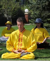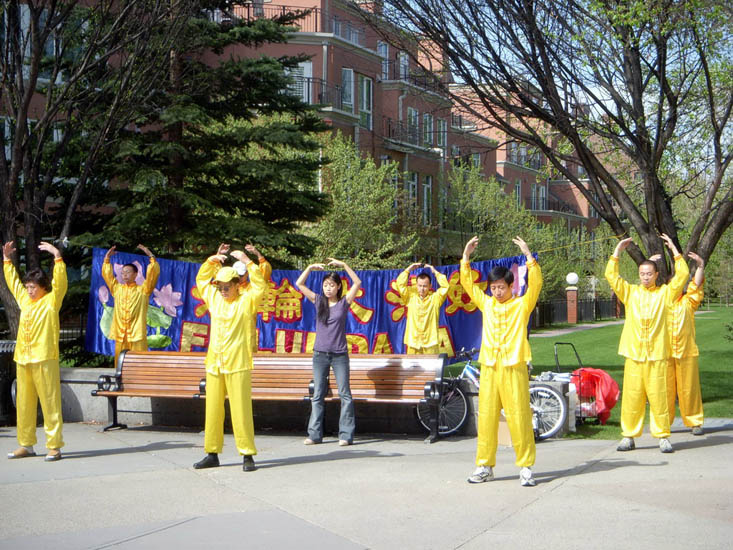 ![]() 卡尔加里法轮功学员为庆祝五∙一三世界法轮大法日,在王子岛公园集体炼功。 |