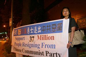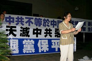退!党!服务中心义工黄女士在发言中表示:中共的存在,国难还会发生,从三十二年前的唐山大地震,拒绝国际的援救,丧失了几十万人的生命。五年前的萨斯病,隐瞒疫情而导致萨斯病大暴发。这次四川大地震,压扣预报地震情报,大地震七十二小时之内救人黄金时段,迟迟不派援兵救助,中共贪官的豆腐渣工程,使建筑物、校房倒塌,使数万人丧失了生命。中共视人命为草芥,却扮演大救主。