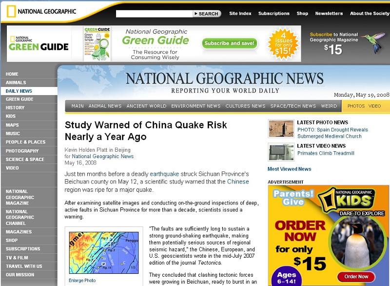 ![]() 美国《国家地理》杂志2008年5月16日报道,2007年7月(10个月之前)《构造》杂志发表论文,预测四川地震。(网站截图) |