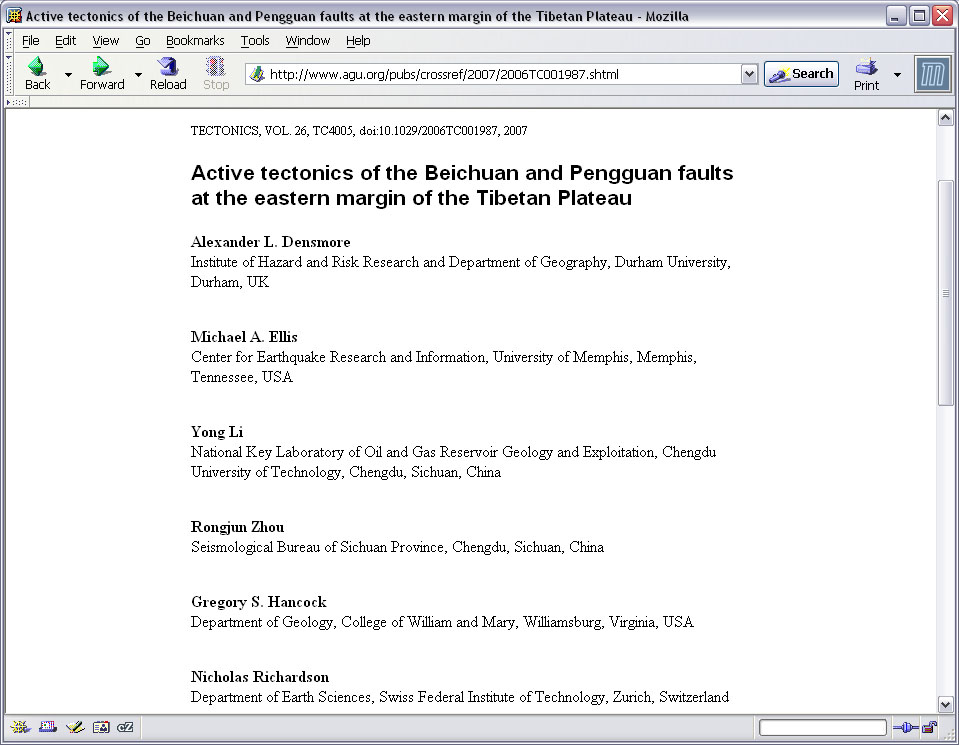 在2007年7月中期国际著名地质构造学专业刊物《构造(Tectonics)》的一篇文章中,中国、欧洲和美国的科学家们写道:“断层的长度已经足以引发一次强烈的撼动地面的地震,它的潜力将成为爆发区域性地震的来源。”他们的结论是,地壳撞击的能量在北川聚积,并将以地震的形式释放出来。(下图是2007年7月中期《构造》杂志发表这篇文章的摘要连接截图(部份),其网络连接为:https://www.agu.org/pubs/crossref/2007/2006TC001987.shtml)