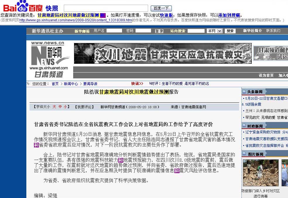现在在网上出现了更多关于中共隐瞒这次大地震的消息,其中一条由新华社5月20日发的一条消息说,甘肃省省委书记、 省人大主任陆浩说甘肃地质局对汶川地震做过预测报告,这可以说是中共事先对震情知而不报的直接证据。这条消息很快被新华社删除了(由于众所周知的原因),但幸运的是,在网友们的努力下,找到了在百度上的快照(下面是百度快照截图)。
