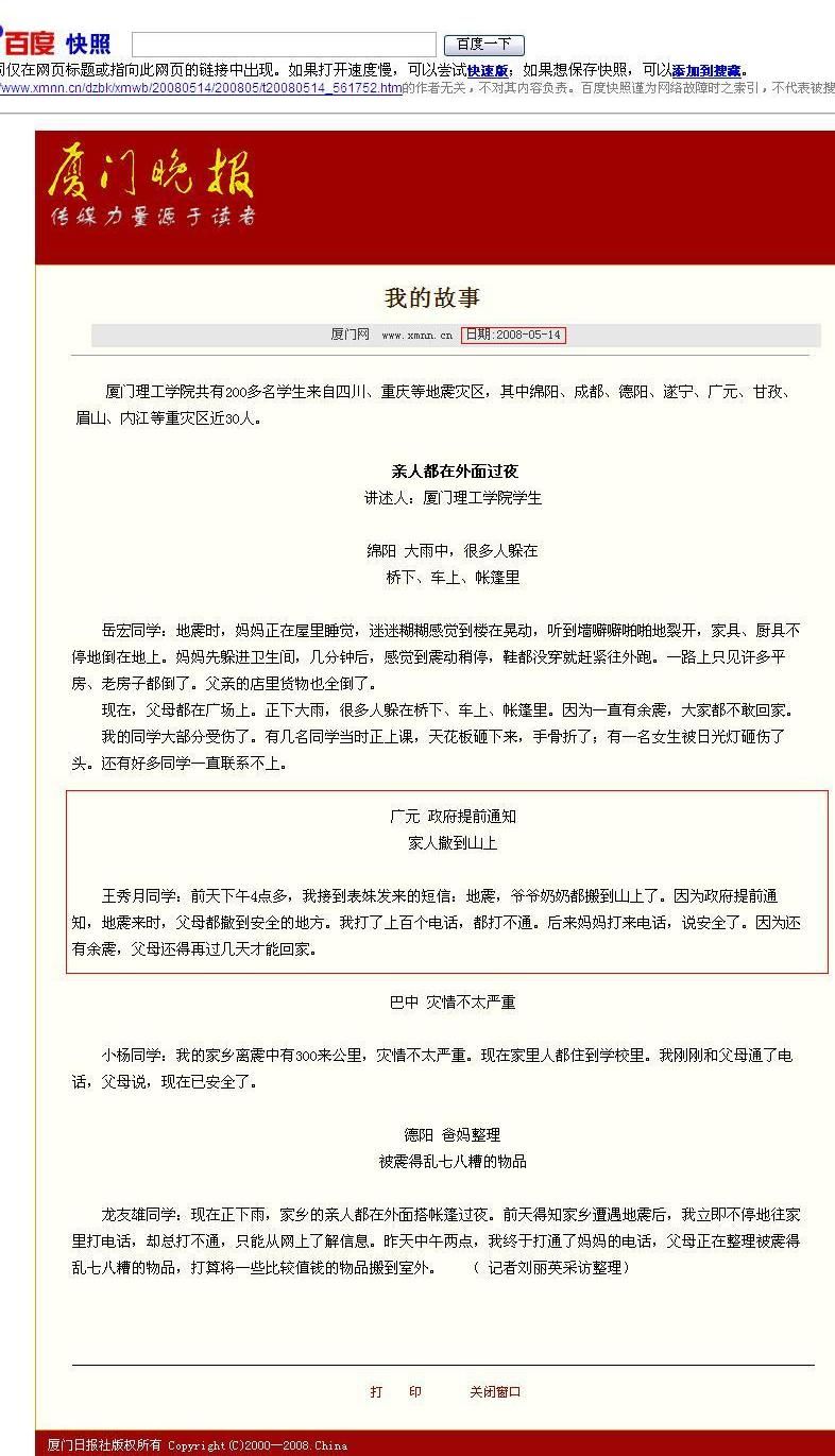 《厦门晚报》在5月14日报导(见下面的百度快照的网络截图,网络上的已经被删除),厦门理工学院一位来自四川,名叫王秀月的学生说,其在四川的家人震前得到四川省广元政府的通知,而撤到了安全的地方。