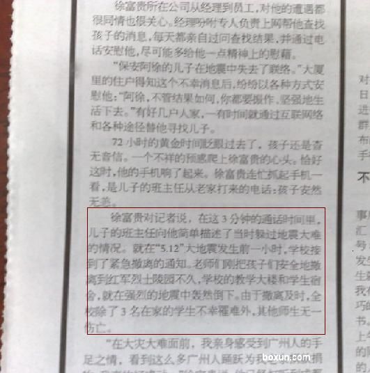 ![]() 5月19日,中国广州《南方工报》的报导显示,汶川某学校在地震前1小时,曾接到紧急通知。印刷版影印图局部。 |