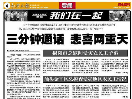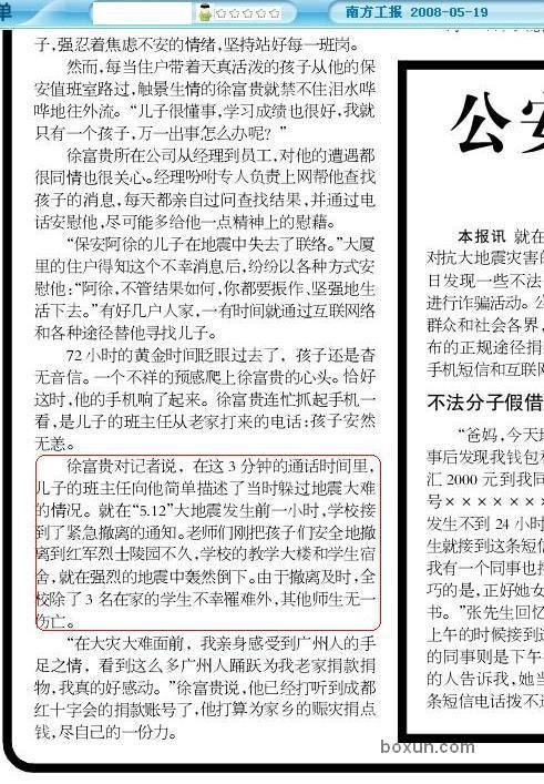 除此之外,现在还有国内媒体报道的佐证,表明中共在震前是知道地震预报的。例如,5月19日,中国广州《南方工报》一篇“三分钟通话 悲喜两重天”的新闻报导显示(见下面的报纸网络版和影印图,网络版本已经被删除),汶川某学校在地震前1小时,接到紧急通知,于是老师带着学生紧急撤离而避免了伤亡。
