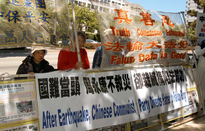 当天中午,在中领馆前的抗议民众展开“国难当头,周永康不救灾却栽赃陷害法轮功”,以及“抗议周永康收买暴徒在海外华人社区制造仇恨”的长幅标语;并向经过此地的民众派发真相传单,揭露中共政法委书记周永康,在国难当头之时,直接指挥中共的特务机构,在海外煽动仇恨,利用其背后控制的亲共华人侨团和留学生,在旧金山、纽约、 香港、日本等地攻击参加声援中国民众退!党!集会的华人。周永康是中共前公安部长,一直是帮助江泽民镇压法轮功的元凶。