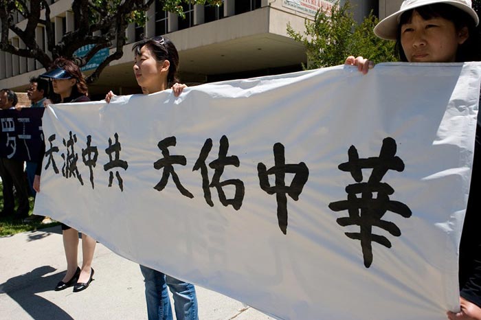 你们在加州举着“爱国”的国旗,你们知道这个国旗代表着什么吗?这个国旗是共产党强加给中国人民的,过去的红祸代表了共产党残杀人民的血腥。你们高举这样的血旗,你们不感到羞耻吗?而且共产党就是一个外来的政党,你们的祖宗马克思、列宁都不是中国人,他们是犹太人的败类。你们共产党是俄国人的干儿子,你们共产党是一个外来的政党,你们不代表中国人,你们代表不了中华民族。所以天灭中共,天佑中华,中国共产党灭亡了,中国人民才能从这些天灾人祸中解脱出来。