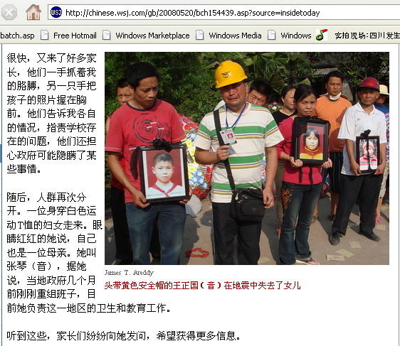 四川大震发生一周后,《华尔街日报》记者驾车离开成都,向北驶往五福镇。这位记者记录到,沿路岔道旁时而出现花圈和白纸黑字的标语,上面写着“孩子们不是死于自然灾害”、“天灾不可违,人为最可恨,给冤死的孩子一个公道”。