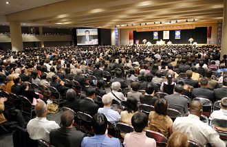 这次法会迎来了五千五百多名来自世界各地的部份法轮大法学员,分别容纳在两个会场。其中十二位学员在法会上发言,他们从神韵演出到“真善忍”画展,从大法弟子办的媒体的销售、日常的工作到“·九·评*点”讲真相等方面,与大家分享了如何在其中修好自己,助师正法的修炼体会。