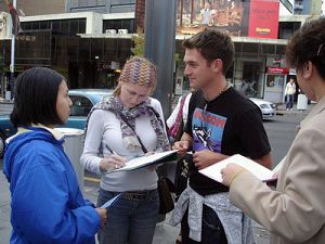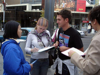 奥克兰市中心皇后街上,人们关注法轮功真相,踊跃签名反迫害 |