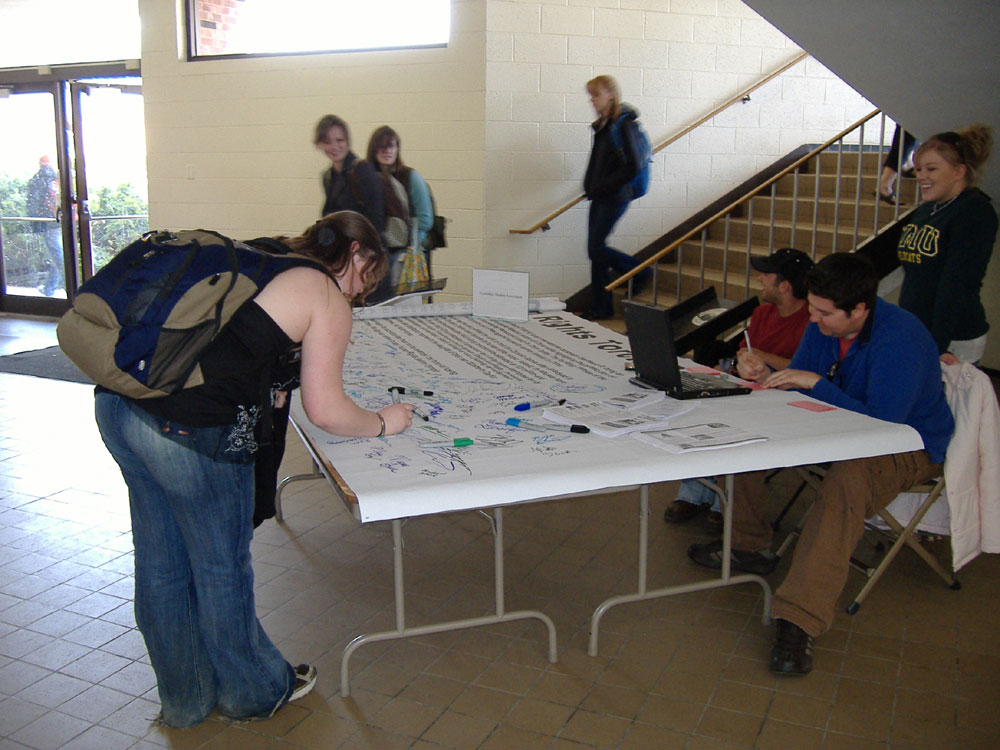 在三天的活动里,征集签名活动从每天早上八点开始,进行到下午六点。最后一天在学校的星巴克咖啡店外进行到晚上九点。“您愿意在横幅上签名,呼吁停止在中国发生的迫害人权之暴行吗?”学生们一遍一遍的喊着。
