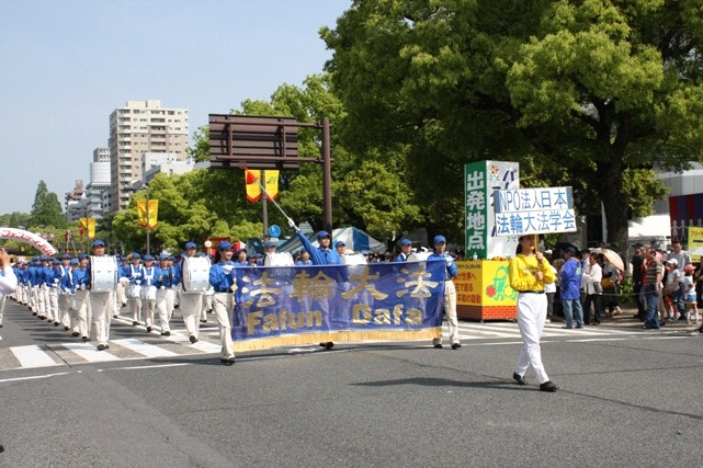 正因为如此,“广岛鲜花节”组委会及市政相关部门才能年年顶着来自中共的各种压力,年年都向日本法轮大法学会发出真诚邀请。当法轮大法的队伍走过主席台时,大会播音员用激动而高亢的声音介绍法轮大法的美好,为这支特殊的团队鼓劲加油,并鼓励市民们加入这支修炼队伍中去。当这支身着熟悉的黄色炼功服的压阵队伍走过来时,观众们纷纷投上敬佩的目光,热烈鼓掌。