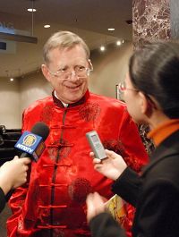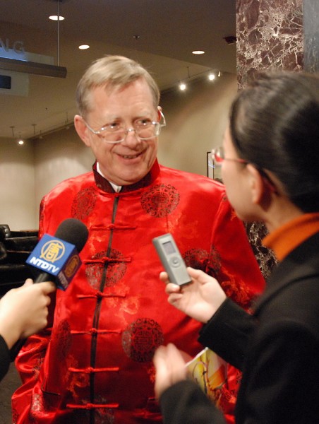 着红色的中式传统马褂的Malcolm Fast说,从今天一大早,就在考虑要穿什么服装来看演出。最后决定,穿上这一身富有中国传统特色的丝绸马褂。Malcolm Fast曾经去过中国十次,他说:“我在中国也看过演出,但不是这种类型。神韵晚会是我看过的文化味道最浓、最传统的演出,是中国大陆的演出无法比拟的。”