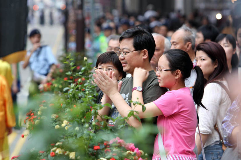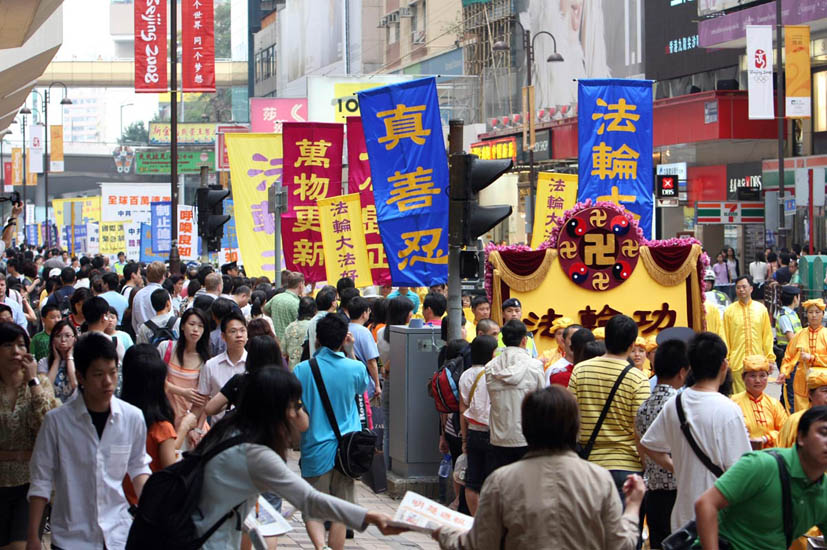 ![]() 香港学员的反迫害游行吸引众多行人观看 |