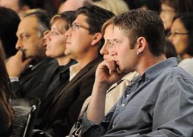 酷爱艺术的地质系二年级学生詹姆斯·马诸若克(James Mazurok),演奏萨克斯风已有七年了。“我最爱今晚的二胡演奏,你都可以感受到演奏家的强烈情感。二胡很象小提琴,但只有两根弦,这比小提琴更难演奏,二胡主要靠手指与身体的动作,与情绪有密切关系。”
