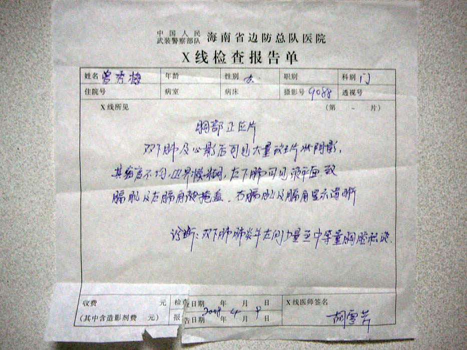 曾秀梅绝食十天左右,他们就开始灌食,因灌食造成肺部创伤,高烧42度。4月9日,恶人把曾秀梅送进中国人民武装警察部队海南省边防总队医院“治疗”。恶人把曾秀梅打伤的程度在医院X线检查报告单是这样写的: