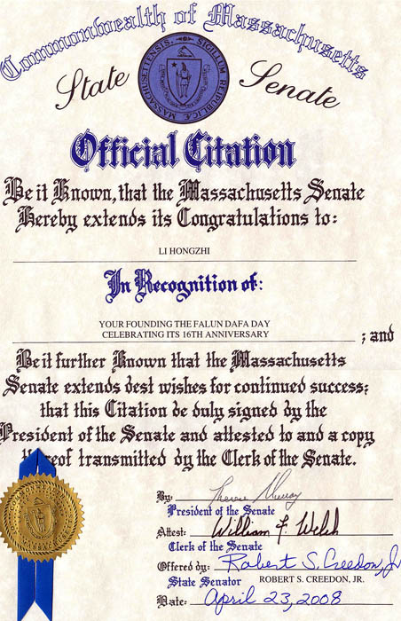 麻萨诸塞州参议院向李洪志先生致以最衷心的祝贺!