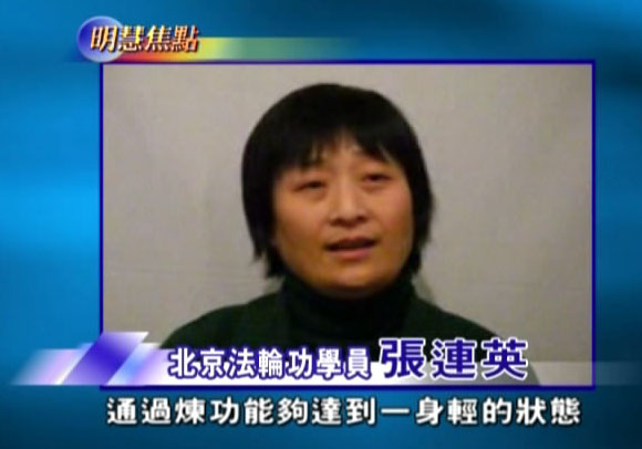 【张连英】当我看到那儿有人炼功时,我就问:你们在这儿炼法轮功多久了,他们说已经很久了。那么我是头一次看到,我也说试试吧,比划比划吧,因此就开始第一次炼功。炼完功,我炼了半个小时,因为书还没有全部看完,但是也看到过书中写着;炼功能够达到一身轻的状态,结果炼完功之后,真是达到一身轻的感觉。炼完功往回走的时候,我就觉的全身轻飘飘的状态,心里有说不清的一种喜悦,觉的这个功法太神奇了。第二天从公司下班以后回到家连饭也不想吃了,就想去看看(炼功)开始了没有,就想去炼这个功。就从那开始,我就走进了修炼。