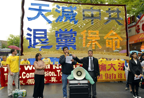 来自新加坡,现居住在纽约的华人洪先生从集会旁路过,记者问他是否了解法拉盛最近发生的攻击法轮功事件,他说:“我太知道了。这些天一直在看。”那么这起事件是否是因为四川地震的缘故呢?他说:“我觉得跟地震没关系,是有人想抢功劳。(中领馆的人)想借机把法轮功打下去,自己不就有功劳可以升官发财了吗?!”问他感觉今天的集会怎么样,他说:“挺好的。共产党那边的人今天好象没有冒头嘛。”记者告诉他马路对面有十几个人在叫骂,洪先生回首观望了一下说,“没几个人,大概是没钱了。他们是一个小时给十块钱,大概(中领馆)没钱了,坚持不下去了。”