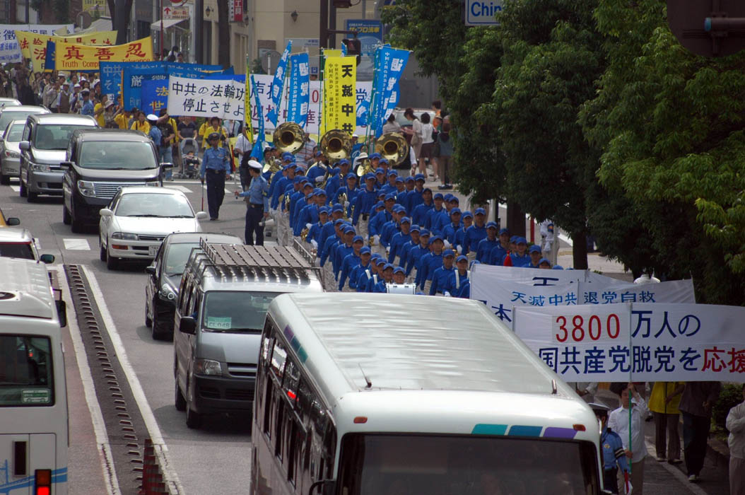 集会后,声援人士绕中华街附近的繁华市区和山下公园进行了近二小时的游行。天国乐团振奋人心的鼓声和吹奏乐引来行人无数赞叹。游行者沿途向当地市民、观光者和华人发放了大量有关三千八百万中国民众退出中共相关组织及揭露中共法拉盛暴行的真相资料。
