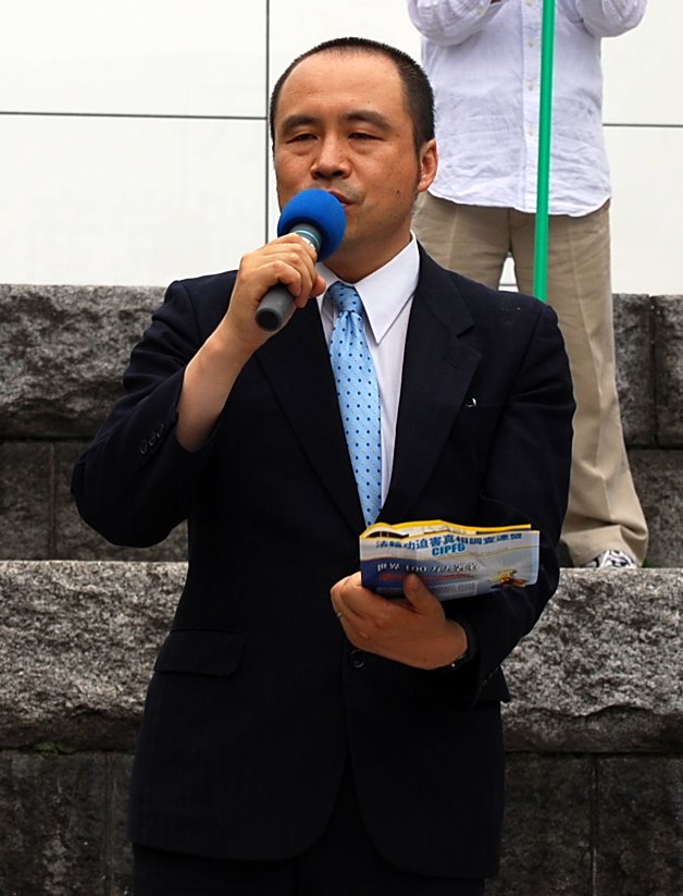 法轮功受迫害真相联合调查团(CIPFG)日本分团副团长安东干先生在集会上发言,祝贺三千八百万中国人退出中共,并介绍了即将在六月十八日到达日本的人权圣火活动。