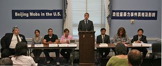 在新闻发布会上播放了中共特务在纽约法拉盛暴力攻击法轮功学员的录像。