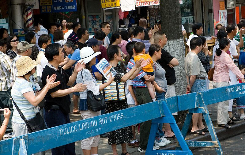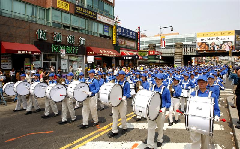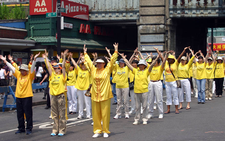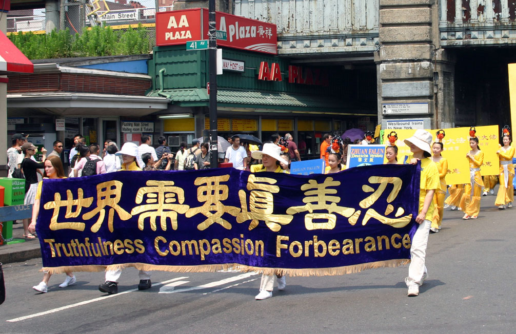 虽然天气炎热,沿途仍有很多观看者,游行于中午十二时开始,从缅街与四十一路开始〔Main Street & 41th Road〕,途经法拉盛最繁华的缅街,从富兰克林街转到凯辛那大道。游行规模盛大,主题是“法轮大法好”,有六大方阵组成,包括“天国乐团”、法轮大法介绍、反迫害、法轮大法洪传、·九·评*退!党!等。