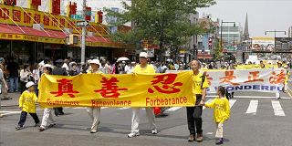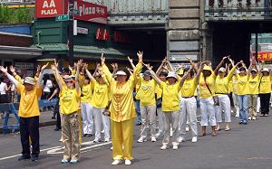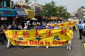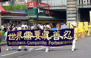一位刚从中国大陆出来的男士看到法轮功的游行及集会,他说:“我看到了法轮功学员的善,心里很感动。”