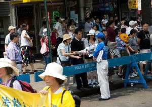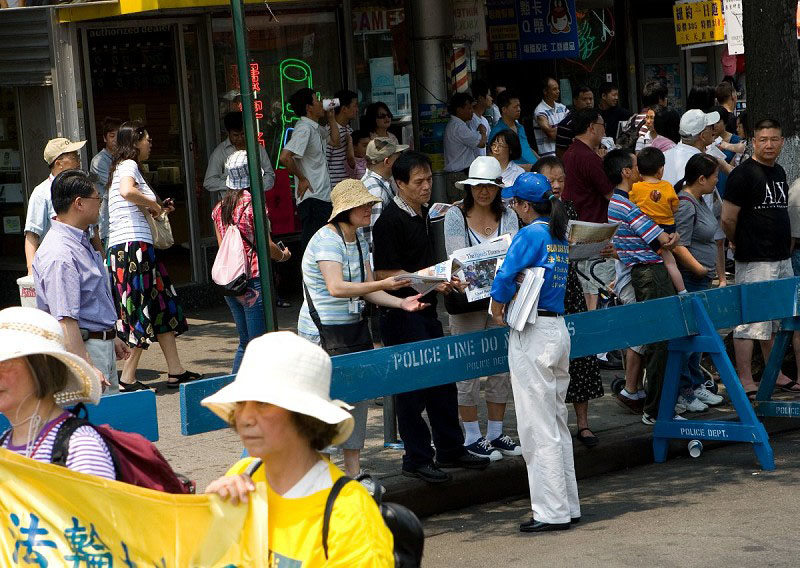 一位华人男子见到法轮功学员在骄阳之下不断的发资料给路人,感动之余送来了饮料,他说:“我自己并没修炼,但我了解法轮功,我知道法轮功是好的,中共对法轮功的迫害是不公平的。”