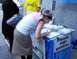 正值放学和下班的尖峰时段,来往的学生、上班族及游客们皆被法轮功的真相标语和图片展板所深深震撼。人们感到震惊与愤怒,签名反对中共的迫害。