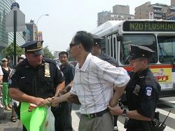 六月十四日下午,反对迫害法轮功、声援退!党!大游行和集会在纽约法拉盛图书馆附近的四十街和缅街举行。游行和集会吸引了众多路人驻足观看。对于这次法轮功游行集会,纽约警方不仅投入了大量常规警力,以防几周前在相同地段支持中共的暴民对平和法轮功学员人身攻击的事件重演,还特别调动了纽约“联合反恐队” (JTTF)加入这次保安工作,因为纽约警察局在游行和集会前获得消息,在游行和集会过程中将有预谋的对法轮功的攻击事件发生。过程中一名中共流氓黑帮拒绝警察让他收起谩骂法轮功的标语走人的要求,被警察收走标语,又因拒绝出示证件,被警察戴上手铐逮捕。