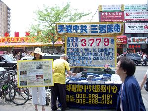 六月八号,纽约天气异常炎热,九十七华氏度,站着不动都会流汗,在法拉盛的大街上,退!党!服务中心的义工们,还有大.纪.元;的发报人员在烈日下仍然辛苦的工作,很多人都表示对法轮功学员的佩服。有人还要捐款给退!党!服务中心表示支持。