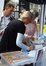 Ingeborg在和其他法轮功学员一起演示功法时,注意到旁边来了一位五六十岁的老人,也和大家一起做动作。刚开始时,Ingeborg还以为是新学员,因为他的炼功动作还挺正确的。后来才发现,这是一位路过的人,想学就跟着一起炼了。在交谈后,这位老人表示,自己可以直接到炼功点学炼法轮功,并记下了当地炼功点的时间和地点。在看到展台上关于法轮功的书籍时,他高兴的表示,自己曾看到过这本书。因为老人母语是土耳其语,学员表示会上网找到土耳其语的书,打印出后给老人带到炼功点上。
