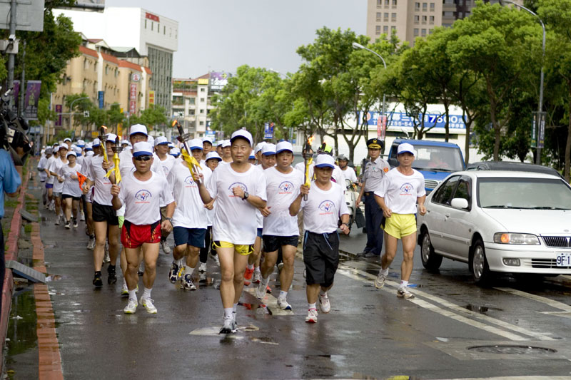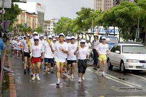 ![]() 人权圣火队在一阵又急又大的雨后出发,三百多位路跑健将持火炬绕行板桥闹区 |