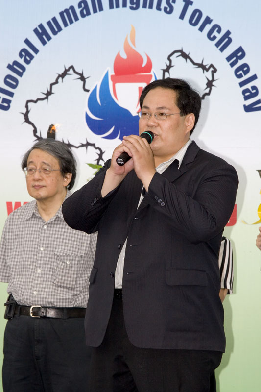 CIPFG亚洲分团副团长邱晃泉律师不辞辛劳的随着人权圣火拜访台北县好几个乡镇市,他认为人权无国界,虽然奥运因为政治因素不能来台,人权圣火却能来台湾,这是台湾人的福气。他强调:和平不能建立在妥协上,而是应该建立在公平、正义、人权的基础上,希望人权圣火传递活动,揭开中共迫害人权的事实,并唤起台湾政府看清中共丑陋的真面目,特别是要关切中国人权问题,不能牺牲,更不能漠视中国人权。
