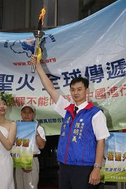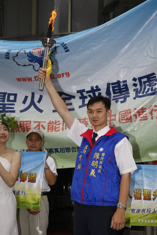 ![]() 林嘉钦主任秘书代表五股乡乡长迎接圣火,同时呼吁中共尊重人权宣言、停止迫害 |