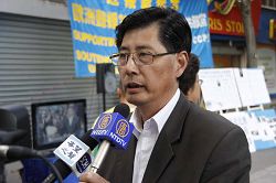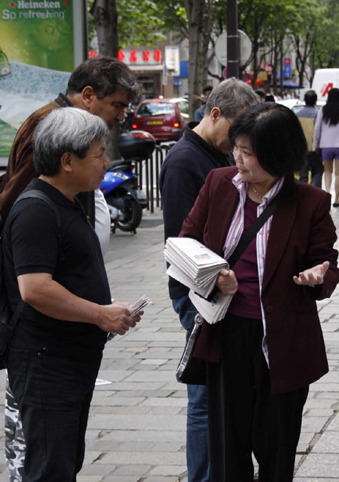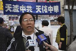 法国退!党!服务中心代表胡先生说:“大家都看到了中共的邪恶,尤其在美国法拉盛事件中,中共使领馆在背后操纵,甚至收买那些地痞流氓来捣乱,还嫁祸于人,迫害法轮功。在国难当头的时候,中共不去赈灾,不去管老百姓的死活,还在镇压无辜的法轮功学员。我们发出强烈的呼声,看清中共的邪恶,不要再受它的蒙蔽,同时也呼吁大家来认识法轮功,认识法轮功是什么,我们信仰的是什么,真善忍是什么。我们的标语‘天灭中共,天佑中华’,中共在中国统治几十年,屠杀了八千万的中国人,现在是天灭中共的时候了。我们希望这里被蒙蔽的华人赶快退出中共,保平安,不要做中共的陪葬品。今天现场就有好几个人退!党!、退*队-。”