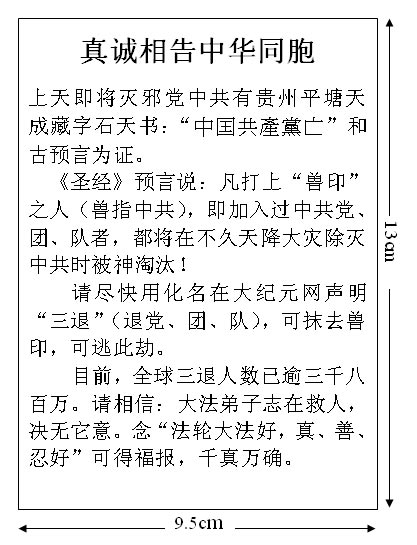 利:1、劝“三:退.”是当前大法弟子救度众生的重要使命之一。在以往印刷的真相资料广泛传播的情况下,辅以手写劝“三:退.”短信,更易引起人们的好奇与关注,从而收到更好的效果。2、短信虽短,但能一语中地,瞬间生效。有缘人见之,一览即知其要,动其善念为后来“三:退.”创造条件。3、短信耗费甚少,成本低廉,而且制作简便快捷高效。一次可复写10份,只需10分钟左右。为缺少资料的弟子提供了讲真相的条件。4、“自封袋”袋装短信柔中有刚、剔透玲珑,便于携带不易损坏。可顺手用图钉按在树上,单元楼的门框上,简便、快捷,而且防潮防雨,可保存较长时间。5、与其它真相资料同袋发放时,可起到锦上添花,甚至是画龙点睛的意外效果。
