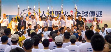 ![]() 在台北市政府广场前的人权圣火活动吸引民众到场声援。人权圣火传递大使准备进行交接。 |