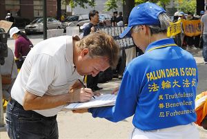 他说,这些天他看到在法拉盛有年长的炼法轮功的老阿姨举着横幅,有年轻的,还有只有十来岁的孩子,都很平和。好象不同年龄的人都能炼。他也看到还有很多外国人在炼法轮功,相信这是一个很好的功法。