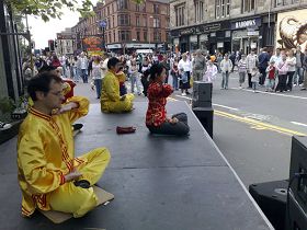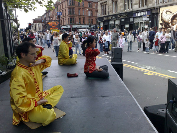 格拉斯哥当地的法轮功学员早已经给艺术节的组委会讲了真相,组委会成员们都知道大法的美好及在中国无辜遭中共迫害的情况。他们每年都邀请法轮功学员到艺术节的舞台上演示功法,这一次也不例外。学员们穿着炼功服,在舞台上很是好看。一位学员拿着话筒给观众讲解着,从功法的原则、中共邪*党-如何迫害法轮功,到中共劳教所的黑幕、法轮功学员的器官被中共活体摘取后贩卖牟利的罪恶,到《·九·评*共产党》和已达三千八百万人的退出中共大潮等等。围观的成百的行人纷纷拍照留念。一位女士在演示结束后问:“真、善、忍”是什么?一位学员引用了《转法轮》〈论语〉中一段给她解释。她说:“说得太对了,我一定要学。”