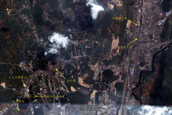 对于第三点,我想到了用真实图片来曝光的办法,这时“谷歌地球”就派上了用场。我就在“谷歌地球”上把贵阳市烂泥沟洗脑班的有关照片截下来,并加上标注。从空中俯瞰邪恶,我想这也会让邪恶恐惧至极。下面就是有关贵阳市烂泥沟洗脑班的照片: