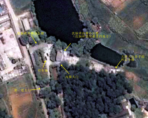 洗脑班是两个区域的设置,内圈是关押大法弟子的地方,由保安和狼狗二十四小时严密看管。外圈要进内圈还要过一道大铁门。关押大法弟子的两层小楼在最里面角落,下层住男上层住女,每间房一个大法弟子外加两个“包夹”,上厕所都要跟着,防守严密与残酷程度比集中营有过之而无不及。