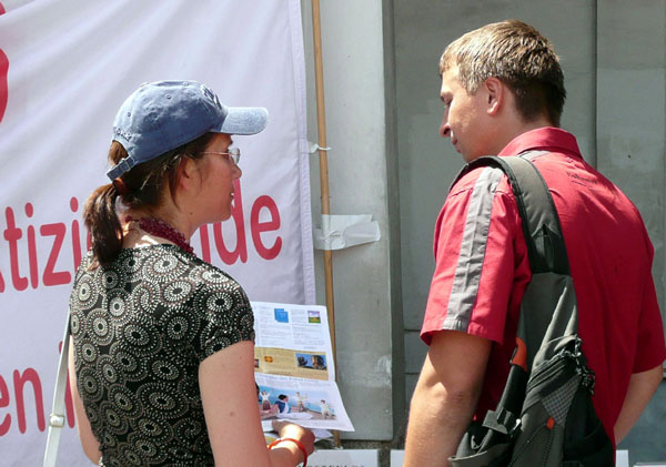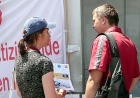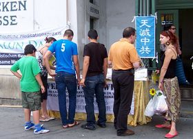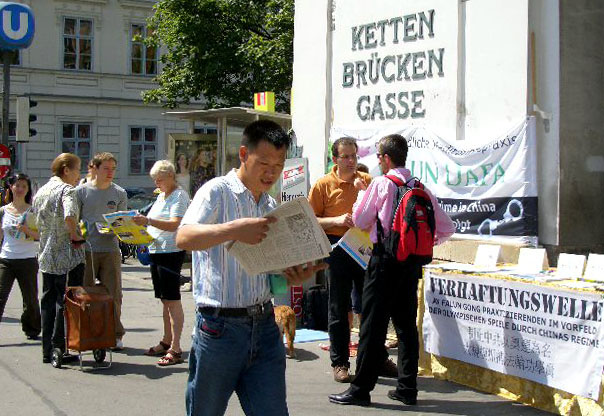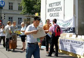 Naschmarkt也是维也纳著名的食品自由市场,尤其到了周末,许多维也纳人前来购物。他们经过法轮功真相信息桌前时,不少民众驻足了解法轮功的真相,索取揭露资料。
