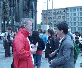 和慕尼黑一样,位于莱茵河畔的科隆也是游客必游之地。科隆以及科隆附近的法轮功学员每星期中有好几天都在科隆大教堂前的广场上设立退!党!服务点,不断有游客当场退!党!,退*团-,退*队-,在二十八日开设的退!党!服务点上也不例外。