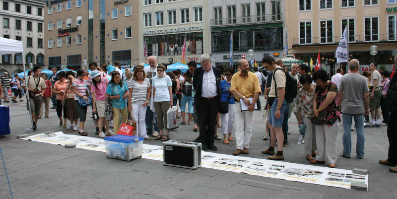 有好几个上了年纪的德国人,自述上个世纪六十年代是毛的追随者(Mao-Fans),但他们当时并不知道中国发生的真实情况。在后来的几十年的岁月中,真相一点点地显露,他们中的绝大部份人通过反思都成为了清醒的反共人士。这几位德国人马上就在要求停止迫害法轮功的签名表上签名了。