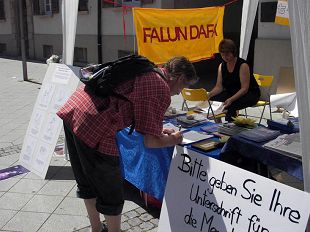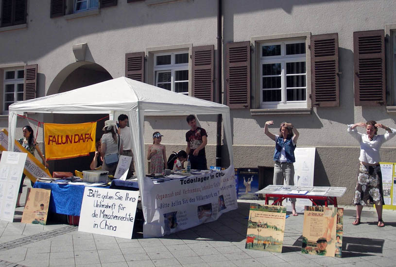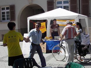 ![]() 法轮功学员在小城莱茵费尔登设立信息台,揭露中共的罪恶。 |