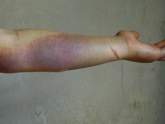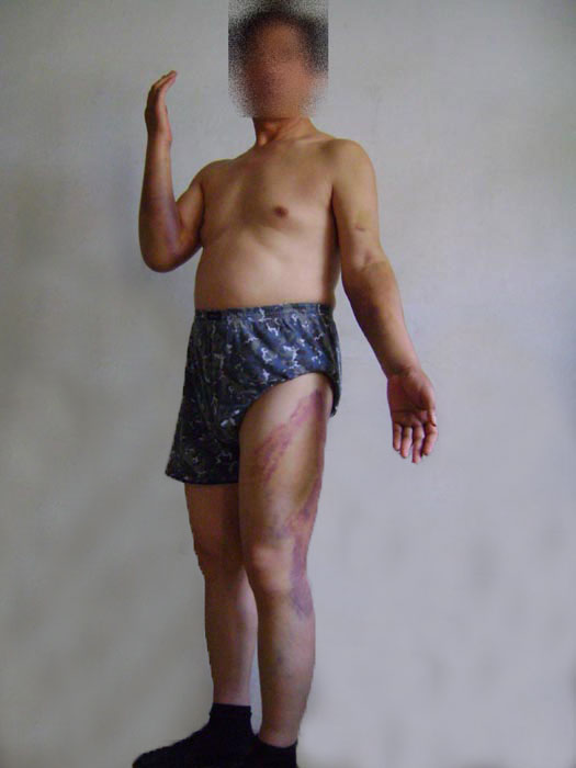 之后,换了个恶警继续监视张照宇,不准睡觉。凌晨五点,恶警又开始殴打。一姓张的恶警下手最狠。恶警强迫张照宇戴着手铐的同时两臂平举,手上放一根橡皮棍,手臂稍一下落就打。新一轮暴打所受痛苦比先前更痛苦数倍。张照宇在极为痛苦的情况下,头撞向铁椅子以抗争,顿时头部大量流血。这一举动使恶警不得不收敛一些气焰。殴打致使张照宇两、三天不能行走,双腿动不了,身体大面积青紫、淤血。
