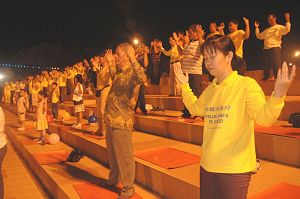 ![]() 学员在马六甲市政府广场前集体炼功。 |