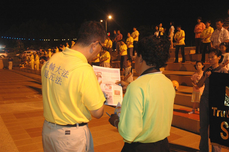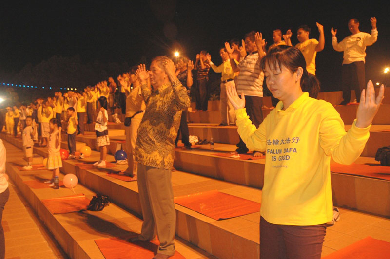 晚上八时许,天国乐团与腰鼓队来到马六甲市政府广场前演奏,壮观的演出吸引了广场的市民与路过的车辆放缓速度观赏。现场还有学员集体炼功,让市民更深入的了解法轮大法。